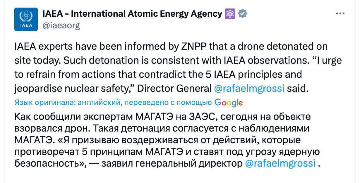 18.04 МАГАТЕ сообщает, что на Запорожской АЭС взорвался дрон