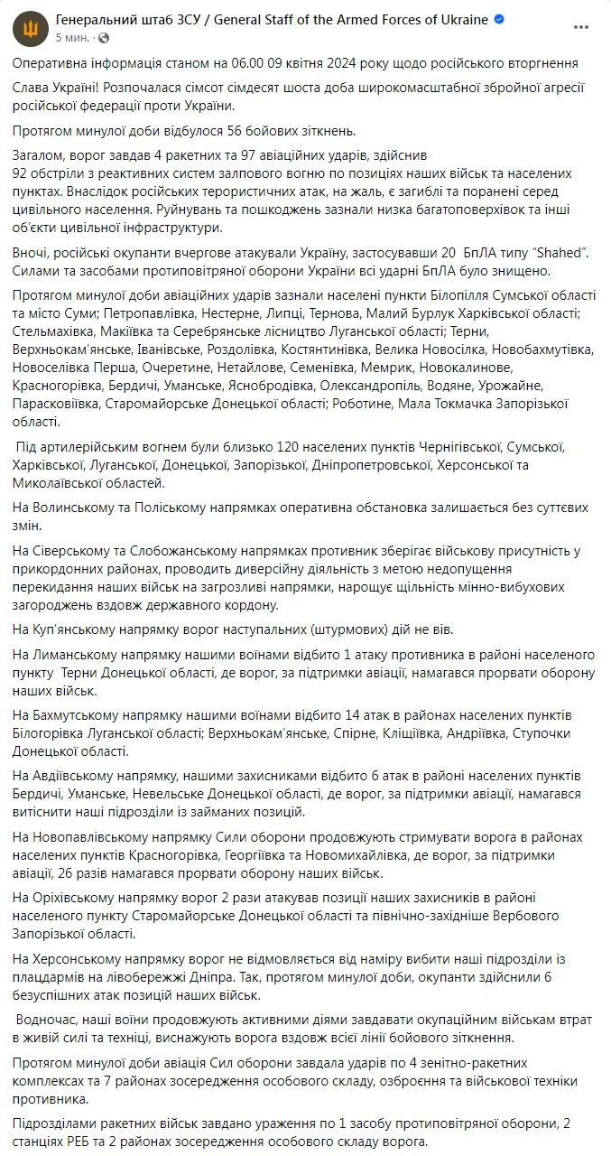 Во вторник, 9 апреля, в Украине идет 776-й день войны с Россией.