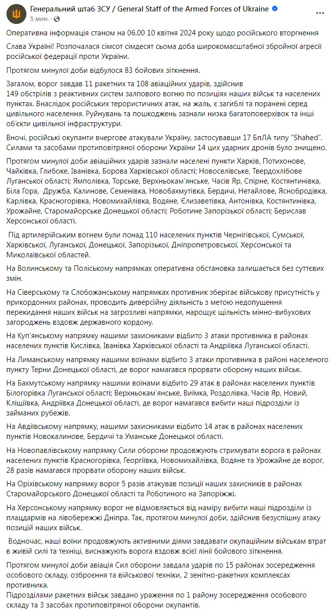 В среду, 10 апреля, в Украине идет 777-й день войны с Россией.