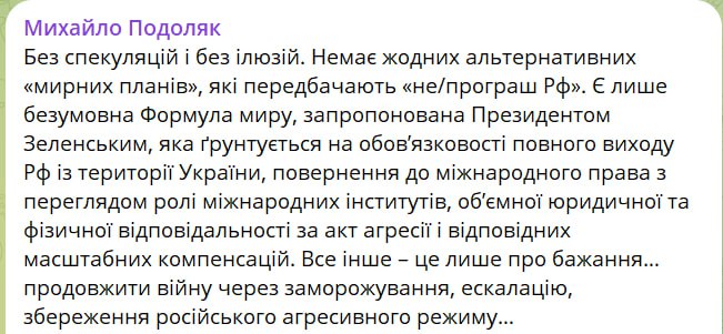 "Нет никаких альтернативных "мирных планов", предполагающих "не/проигрыш России". Есть только безусловная Формула мира, предложенная Президентом Зеленским, которая основывается на обязательности полного выхода России из территории Украины, возвращении к международному праву с пересмотром роли международных институтов, объемной юридической и физической ответственности за акт агрессии и соответствующих масштабных компенсаций", – написал Подоляк.