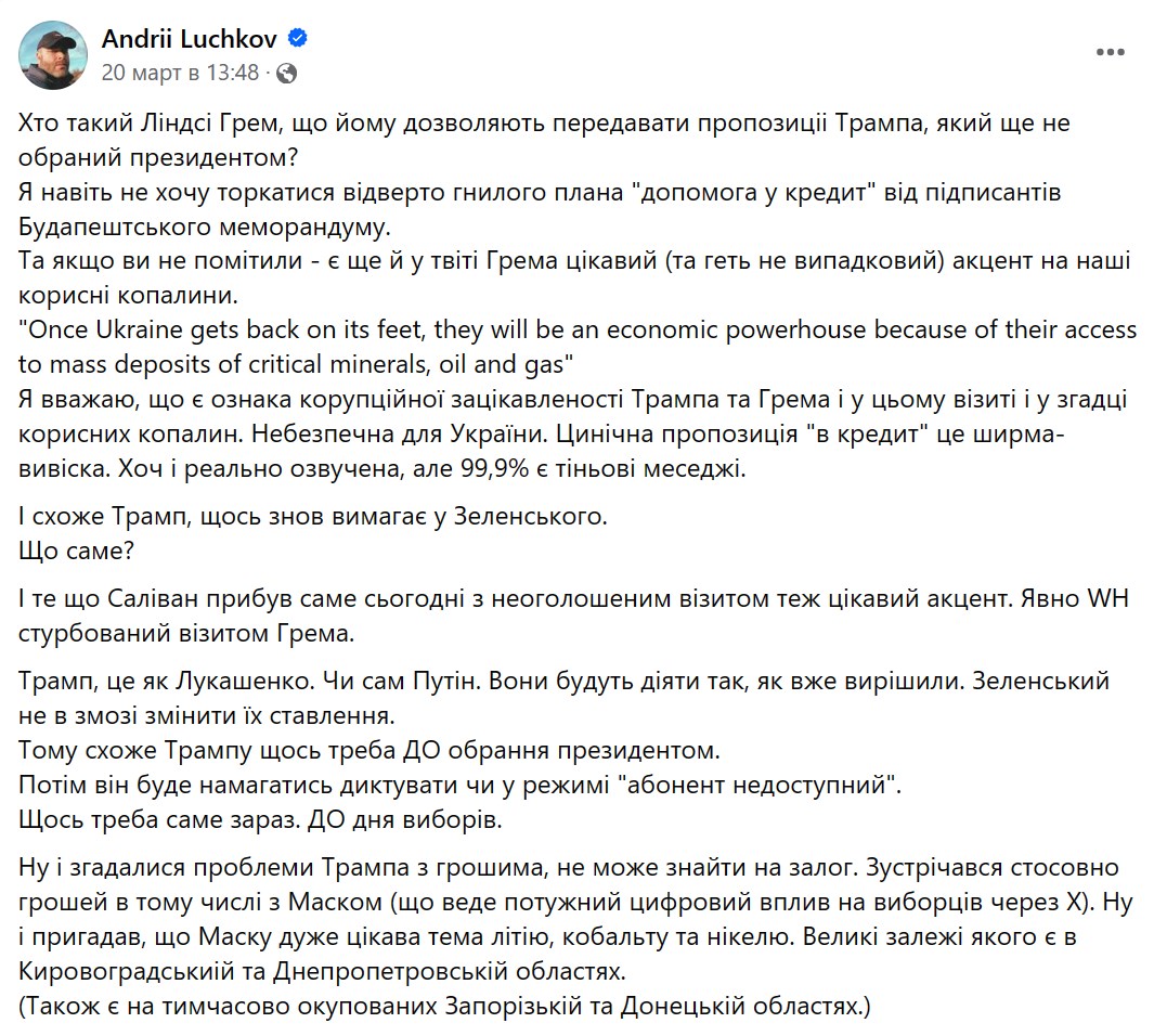 Украинский журналист Андрей Лучков делает из этих намеков вывод, что часть республиканцев, включая Трампа и Грэма, пытаются реализовать схему по установлению контроля над украинскими месторождениями полезных ископаемых. Которые могут выступить в качестве залога для кредитов, которые республиканцы предлагают давать Украине вместо бесплатной помощи.