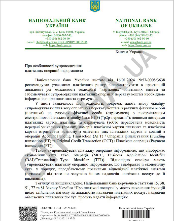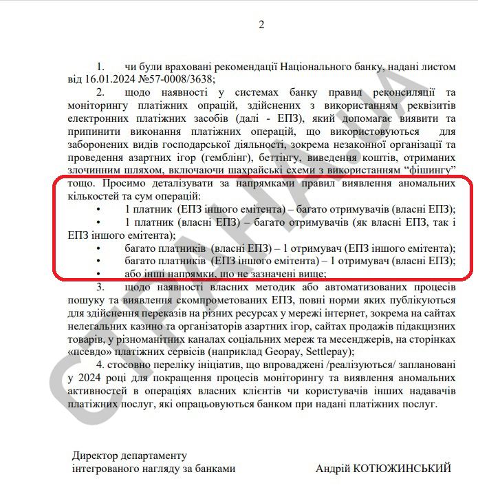 В целом письмо Нацбанка посвящено вопросу сопровождения, отслеживания финансистами клиентских платежей. Еще 16 января 2024 года регулятор потребовал от банков тщательнее анализировать денежные перечисления между карточными счетами, выделять из них аномальные, отслеживать и блокировать. Это все преподносилось в формате рекомендаций и подпадало не только под платежный, но и под финансовый мониторинг. Но из тона сегодняшнего документа понятно, что банкиры не очень активно выполняли совет Нацбанка, а может, и вовсе на него не откликнулись.