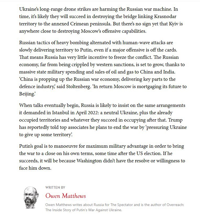 По мнению автора, цель президента РФ Владимира Путина состоит в том, чтобы получить максимальное военное преимущество и завершить войну на своих условиях через некоторое время после выборов в США.