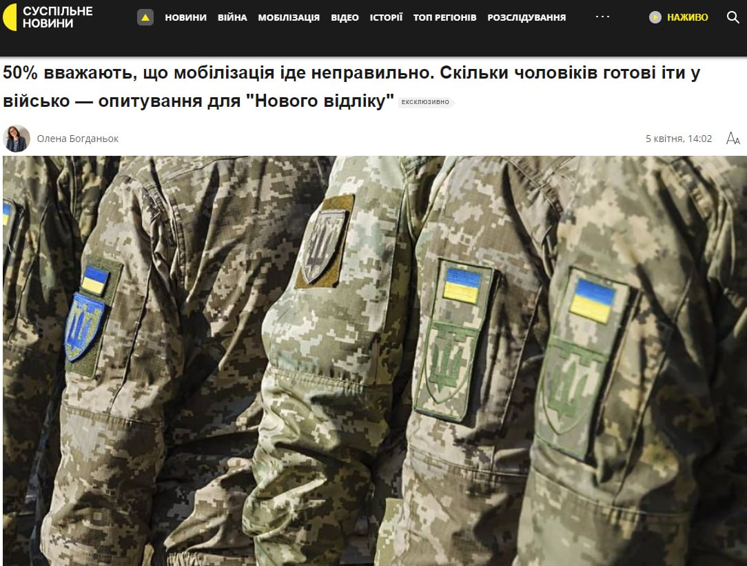 Также, согласно результатам опроса, 50% украинцев полагают, что мобилизация идет неправильно. Ещё 25% воздержались от ответа. 25% опрошенных считают, что мобилизационный процесс идет в правильном направлении.