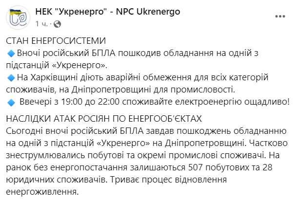 "Сегодня ночью российский БПЛА нанес повреждения оборудованию на одной из подстанций "Укрэнерго" на Днепропетровщине. Частично обесточены бытовые и отдельные промышленные потребители. К утру без энергоснабжения остаются 507 бытовых и 28 юридических потребителей. Идет процесс возобновления энергопитания", - говорится в сообщении.