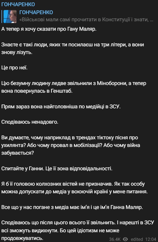 Народный депутат Алексей Гончаренко (сторонник демобилизации) заявил, что Маляр вновь вернули на работу в Генштаб ВСУ и назвал ее "безумной".
