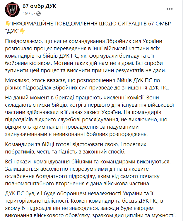 "Сообщаем, что высшее командование ВСУ начало процесс перевода в другие воинские части всех командиров и бойцов ДУК ПС, которые формировали бригаду и являются ее боевым остовом. Мотивы таких действий нам не известны. Все попытки остановить этот процесс и выяснить причины результатов не дали. Возможно, кто-то считает, что распыление бойцов ДУК ПС по разным подразделениям Вооруженных сил приведет к уничтожению ДУК ПС. Сейчас в бригаде работают многочисленные комиссии. Они составляют списки бойцов, с первого дня существования воинской части осуществляли в ее рядах защиту Украины. На командиров подразделений открыты служебные расследования, не исключено, что откроют уголовные производства по надуманным обвинениям в невыполнении боевых предписаний. Командиры и бойцы готовы отстаивать свою, и павших собратьев, честь и достоинство законным способом. Все приказы командования бойцами и командирами выполняются. Остаются совершенно непонятными действия на полное ослабление боеспособного подразделения, которым с самого начала полномасштабного вторжения является данная воинская часть", - говорится в заявлении бригады.