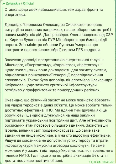 "Был сегодня на Ставке отдельный и подробный разговор о применении РЭБ, о защите критической инфраструктуры. Это касается, в частности, энергетики – того, что защищено, и того, что было, к сожалению, защищено недостаточно. Будут соответствующие выводы", – сказал Зеленский.