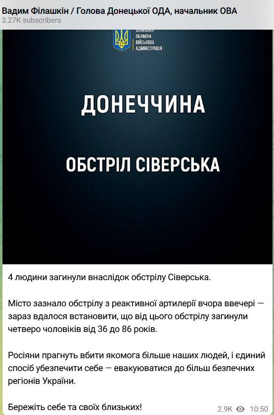 Об этом сообщил глава Донецкой областной военной администрации Вадим Филашкин в своем телеграм-канале.