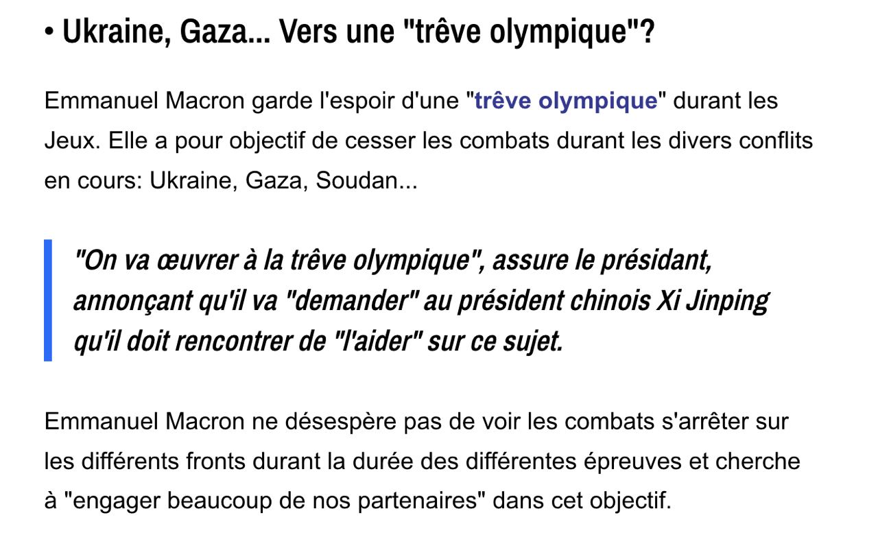 "Мы будем работать над олимпийским перемирием", - заверяет президент, объявляя, что "попросит" президента Китая Си Цзиньпина, с которым ему предстоит встретиться, "помочь" ему в этом вопросе.