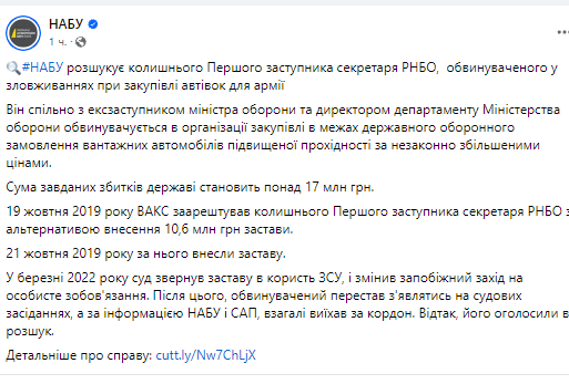 Об этом сообщила пресс-служба НАБУ.