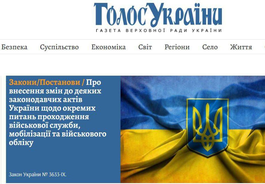 Подписанный накануне президентом Украины Владимиром Зеленским закон о мобилизации опубликован в официальном парламентском издании "Голос Украины".