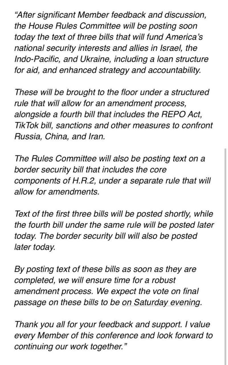 Спикер Джонсон анонсировал, что Палата представителей разделит законопроект о помощи Украине и союзникам на четыре части. Отдельно будут голосовать законопроекты о помощи Израилю, Украине, Тайваню (а вместе с ним и другим союзникам по индо-тихоокеанскому региону). А в четвертый законопроект заложат дополнительные предложения, такие как возможность предоставления помощи Украине взаймы, положения о конфискации российских активов, новые санкции против Ирана, а также запрет социальной сети ТикТок в США.