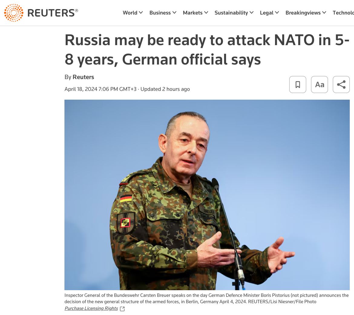 21.54 Если Россия решит напасть на НАТО, то будет готова к этому через 5-8 лет.
