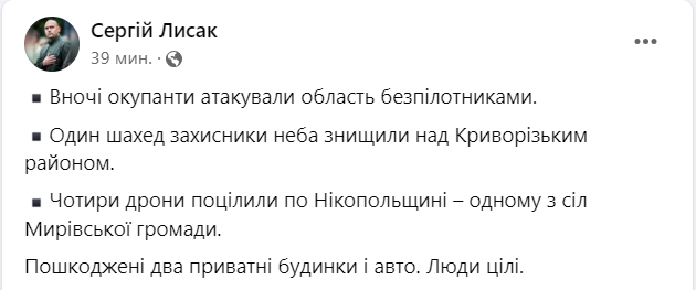 "Четыре дрона попали по Никопольщине – одному из сел Мировской громады. Повреждены два частных дома и авто",- написал он.