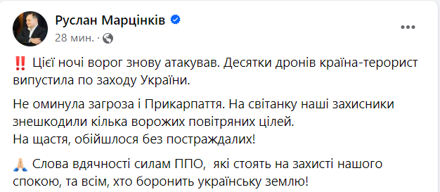"Этой ночью враг снова атаковал. Десятки дронов страна-террорист выпустила по западу Украины. Не обошла угроза и Прикарпатье. На рассвете наши защитники обезвредили несколько вражеских воздушных целей", - написал он.