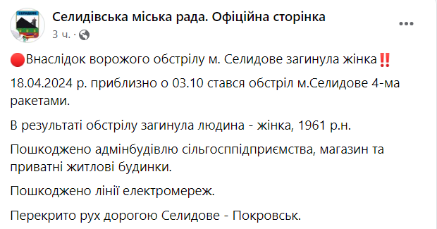 "18.04.2024 г. примерно в 03.10 произошел обстрел г.Селидово 4 ракетами", - говорится в сообщении.