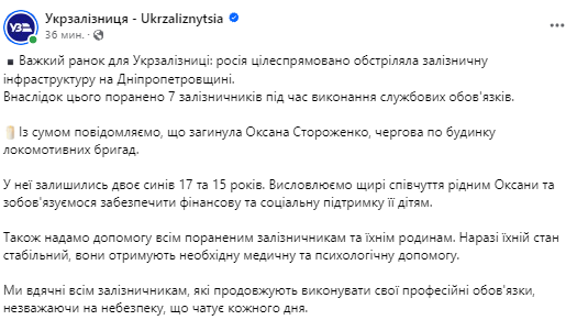 "Тяжелое утро для Укрзализныци: Россия целенаправленно обстреляла железнодорожную инфраструктуру на Днепропетровщине. В результате ранены 7 железнодорожников во время исполнения служебных обязанностей" - говорится в сообщении.