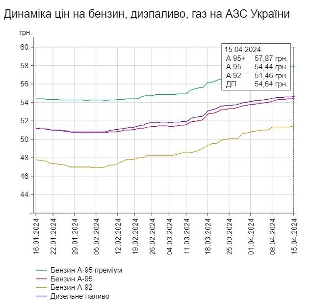 Бензин и дизель в Украине за последний месяц подорожали в среднем на полторы гривни за литр - и это ещё не предел. За последние несколько дней цена бензина А-92 выросла до 51,46 гривен за литр, А-95 — до 54,44 гривен, дизель — до 54,64 гривен.
