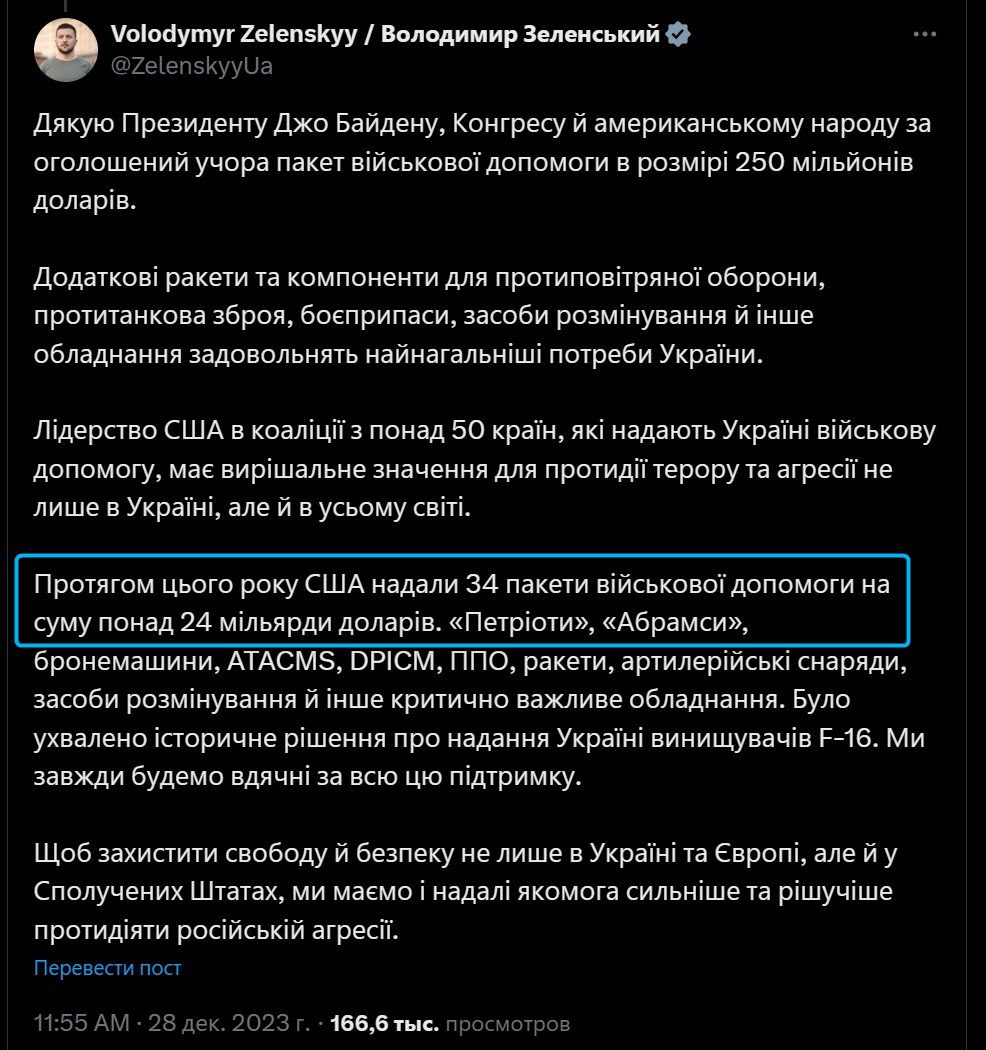 При том, то за прошлый год, по данным президента Владимира Зеленского, США передали Украине пакетов помощи на 24 миллиарда (на скриншоте).