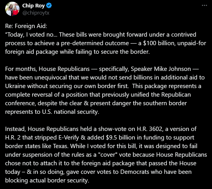 "В течение нескольких месяцев республиканцы Палаты представителей, в частности спикер Майк Джонсон, однозначно заявляли, что мы не будем направлять миллиарды дополнительной помощи Украине, не обеспечив сначала безопасность нашей собственной границы. Этот пакет представляет собой полный пересмотр позиции, которая ранее объединяла республиканскую фракцию", - написал член Палаты представителей Чип Рой из Техаса на странице в Х.