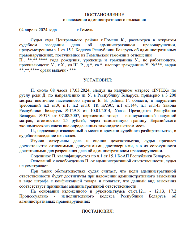 Согласно решению суда, украинец должен уплатить штраф в 400 белорусских рублей (около 5 тысяч грн), а матрас фирмы "Интекс", стоимость которого оценили в 25 рублей (около 300 грн), подлежит конфискации. О дальнейшей судьбе гражданина Украины ничего не сообщается.