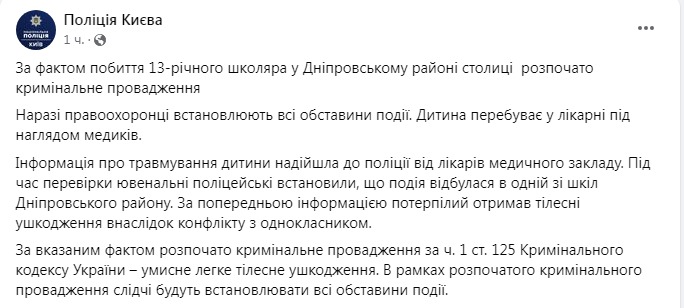 "Информация о травмировании ребенка поступила в полицию от врачей медицинского учреждения. В ходе проверки ювенальные полицейские установили, что происшествие произошло в одной из школ Днепровского района. По предварительной информации, потерпевший получил телесные повреждения в результате конфликта с одноклассником", - сказано в публикации правоохранителей в Фейсбуке.