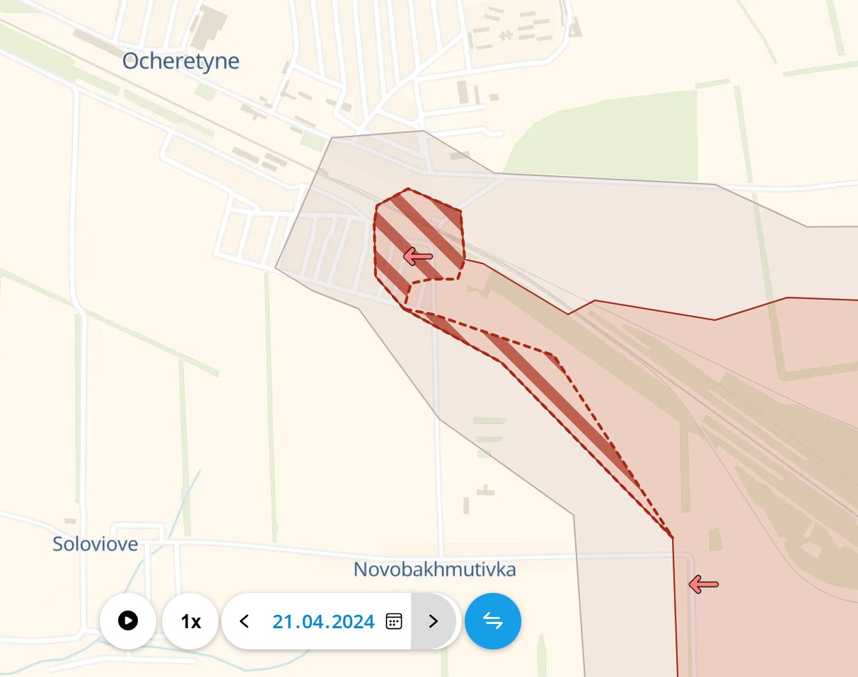 Также, по данным Deep State, противник продвинулся в Очеретино. Причем, судя по динамике карты, довольно существенно.
