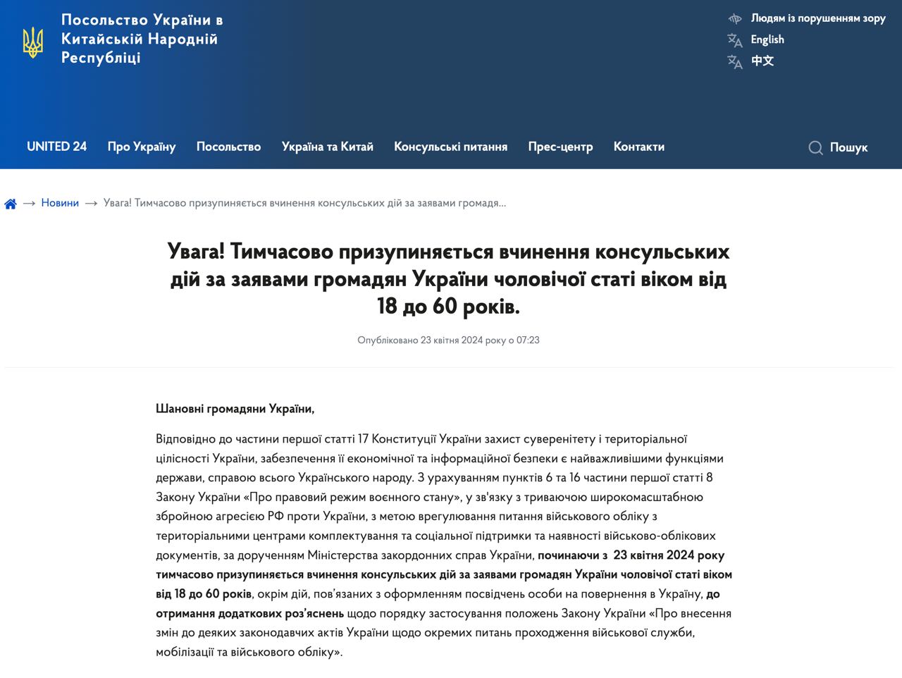 А посольство Украины в Китае подтвердило подлинность распоряжения МИДа, опубликованное вчера СМИ, о временной приостановке всех консульских действий в отношении граждан Украины призывного возраста.