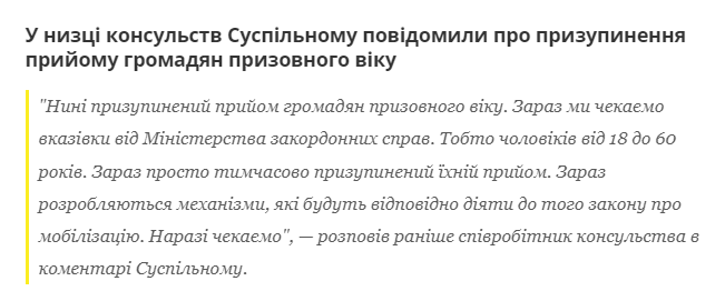 "Сейчас мы ждем указания от Министерства иностранных дел. Сейчас просто временно приостановлен их прием. Сейчас разрабатываются механизмы, которые будут соответственно действовать до закона о мобилизации. Сейчас ждем", – рассказал сотрудник консульства в комментарии "Суспильному".