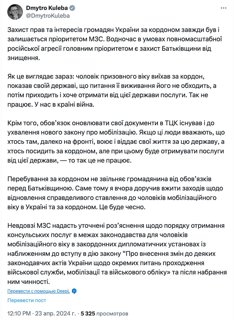 "Как это выглядит сейчас: человек призывного возраста выехал за границу, показал своему государству, что вопрос его выживания его не касается, а потом приходит и хочет получить от этого государства услуги. Если эти люди считают, что кто-то там, далеко на фронте, воюет и отдает свои жизни за это государство, а кто-то посидит за границей, но при этом будет получать услуги от этого государства, - то так это не работает", - пишет Кулеба в Х.