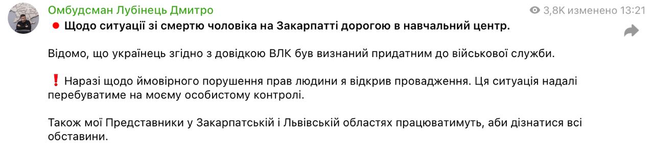 Прокуратура сообщает, что погибший был мобилизован. Сообщается, что он умер во Львовской области по дороге на Закарпатье. Где он был мобилизован и прошел медкомиссию, которая признала его годным, не уточняется.
