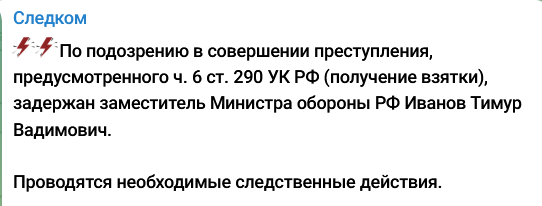 "По подозрению в совершении преступления, предусмотренного ч. 6 ст. 290 УК РФ (получение взятки), задержан заместитель Министра обороны РФ Иванов Тимур Вадимович. Проводятся необходимые следственные действия", - говорится в сообщении.