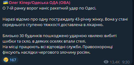 "В 7 утра враг нанес ракетный удар по Одессе. Пока известно об одной пострадавшей 43-летней женщине. Она в состоянии средней степени тяжести доставлена ​​в больницу", - заявил Кипер.