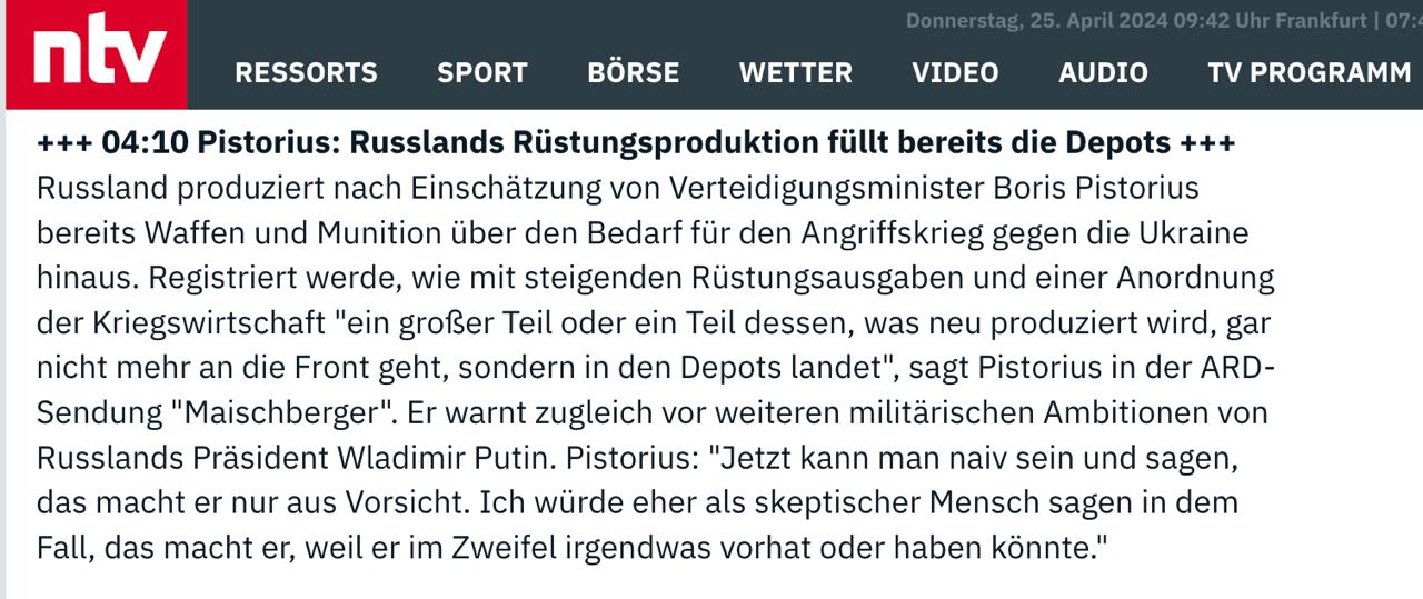 09.52 Россия заполняет склады оружием и боеприпасами, производя его больше, чем используя в Украине, заявил министр обороны Германии Писториус, передает N-TV.
