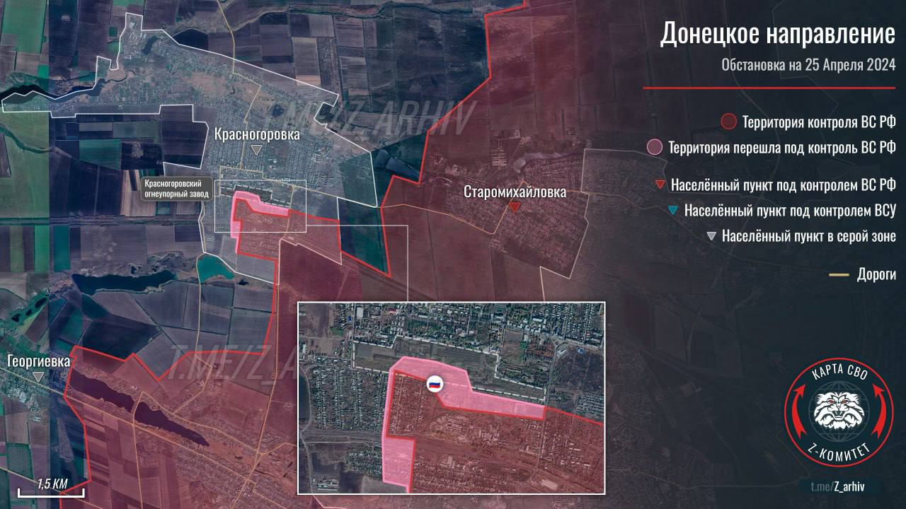 16:03 Российские военные паблики пишут о серьёзном продвижении армии РФ в Красногоровке под Донецком. Они публикуют видео с российским флагом в одном из корпусов огнеупорного завода - ключевой точки обороны ВСУ в городе. По российским картам как минимум часть этого завода уже захвачена россиянами.