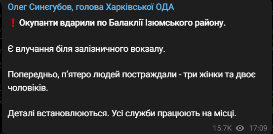 Об этом сообщает глава Харьковская ОВА Олег Синегубов.