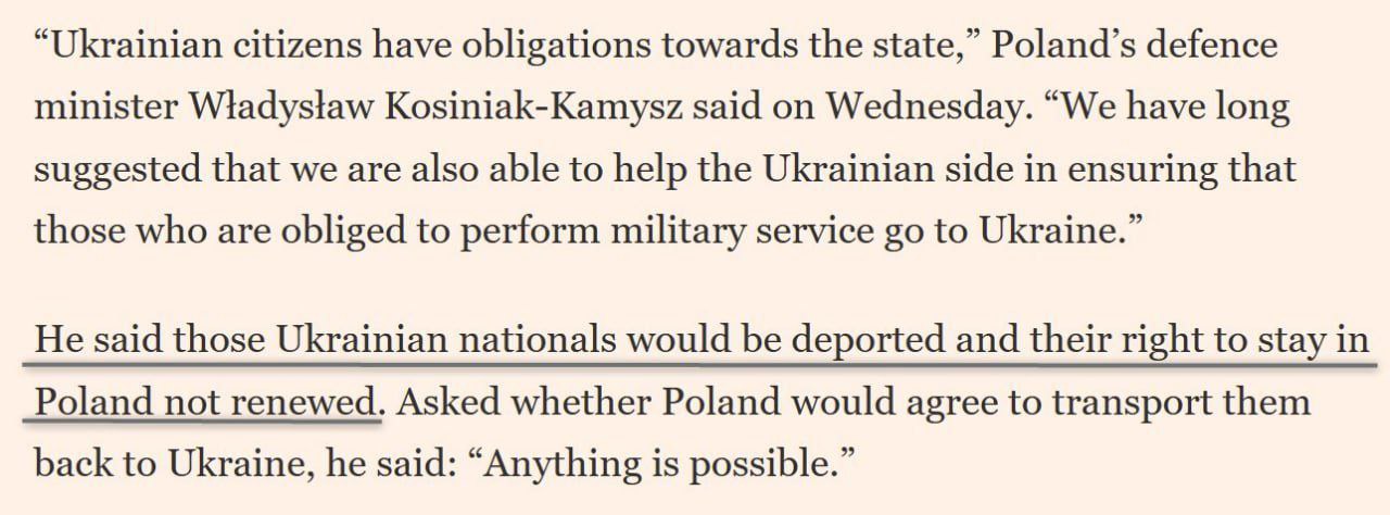 Другие СМИ, польские и международные, не приводят слов министра, где он прямо говорил бы о депортации военнообязанных украинцев.