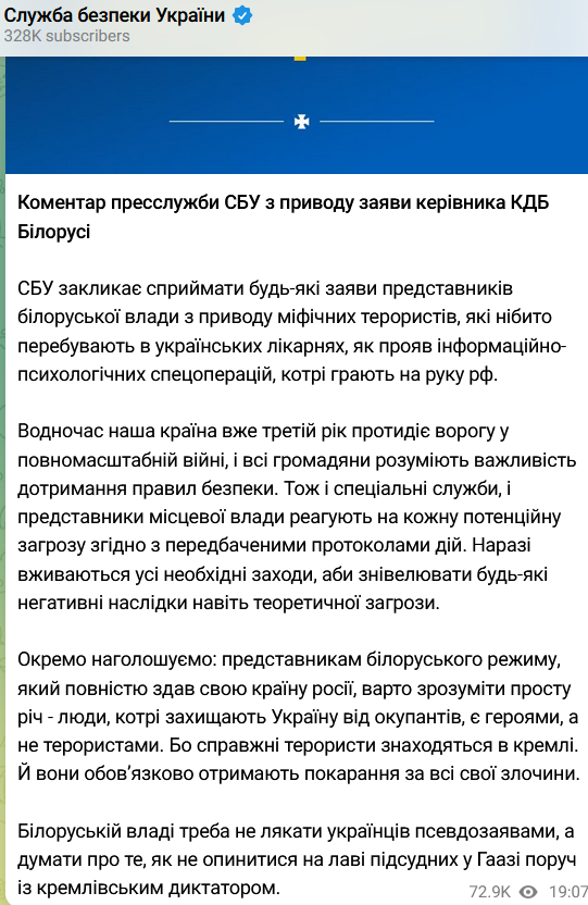 Спецслужба призвала "воспринимать любые заявления представителей белорусских властей по поводу якобы находящихся в украинских больницах мифических террористов как проявление информационно-психологических спецопераций, играющих на руку России".