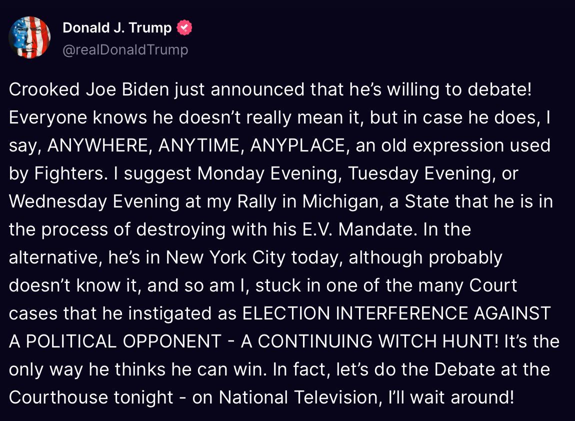 В свою очередь Дональд Трамп заявил, что готов к дебатам в любое время и в любом месте, в том числе в пятницу в здании суда, где идут заседания по уголовному делу против него.