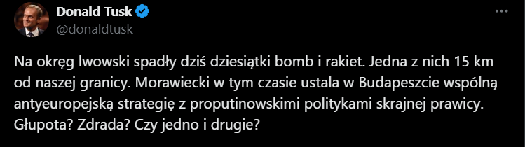 "Десятки бомб и ракет упали сегодня во Львовскую область. Одна из них в 15 км от нашей границы. Между тем, Моравецкий разрабатывает общую антиевропейскую стратегию с пропутинскими ультраправыми политиками в Будапеште. Глупость? Измена? Или и то, и другое?", - написал он