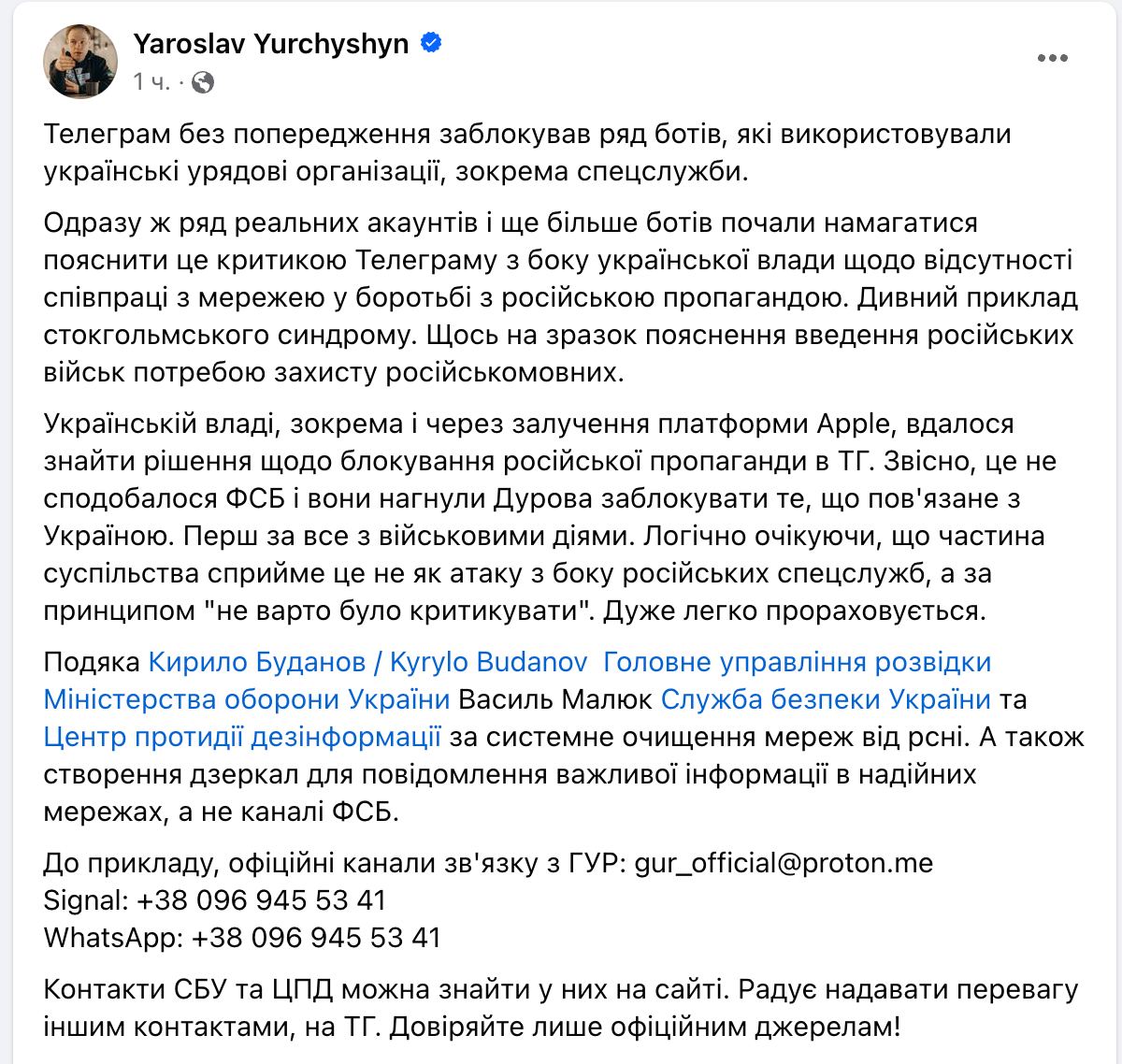 09.50 Глава комитета по свободе слова Рады Юрчишин утверждает, что блокировка украинских чат-ботов, в частности ГУР и СБУ, стала ответом Павла Дурова и ФСБ на попытки Украины повлиять на Телеграм через Apple.