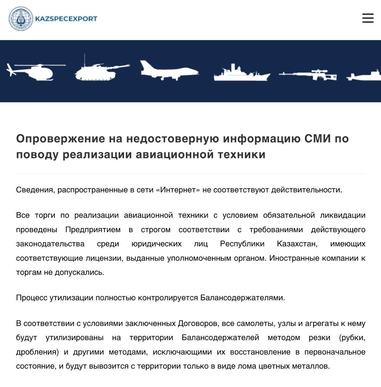 "Торги по продаже авиационной техники провели только для казахстанских фирм с соответствующей лицензией с условием обязательной ликвидации. Иностранным компаниям участие было запрещено", – заявили в "Казспецэкспорте".