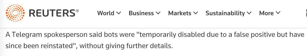 14.57 Представитель Telegram заявил Reuters, что чат-боты украинских силовиков были "временно отключены из-за ложного срабатывания, но затем восстановлены".