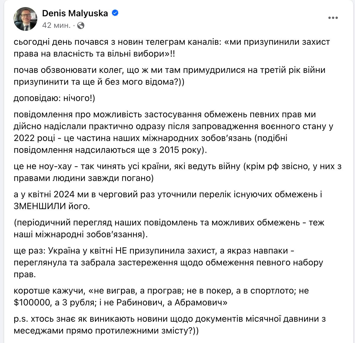 "Сообщение о возможности применения ограничений определенных прав мы действительно направили практически сразу после введения военного положения в 2022 году - это часть наших международных обязательств (подобные сообщения направляются еще с 2015 года). Это не ноу-хау - так поступают все страны, которые ведут войну. А в апреле 2024 мы в очередной раз уточнили перечень существующих ограничений и уменьшили его", - пишет Малюська.