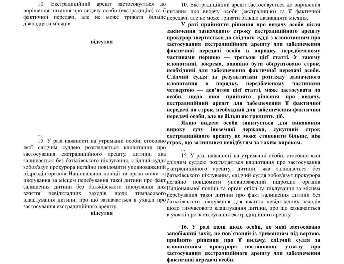 5. Вводится возможность применения ареста для фактической передачи иностранному государству по экстрадиционному запросу лица, в отношении которого истек срок экстрадиционного ареста. Речь идет об иностранных гражданах, находящихся в Украине в отношении которых поступил экстрадиционный запрос.