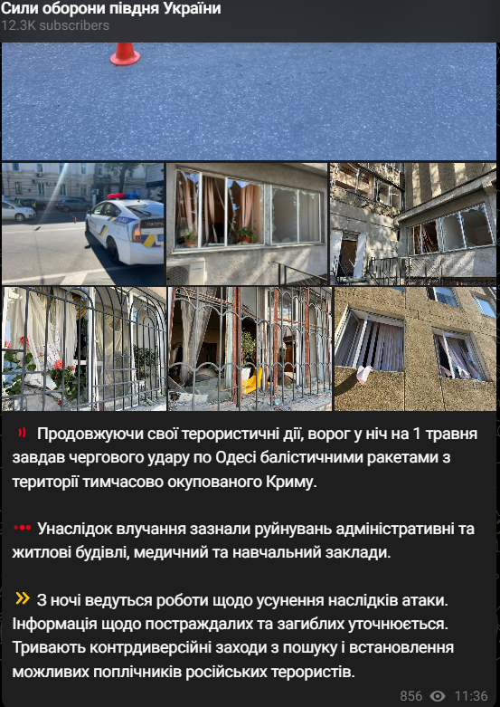 Напомним, в результате обстрела Одессы в ночь на 1 мая погибли три человека. Среди них полицейский. Еще трое людей получили ранения.