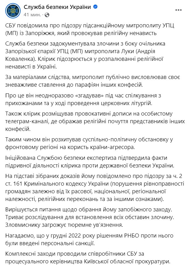 Сообщается, что Лука "размещал провокационные сообщения на личном телеграм-канале, где оскорблял религиозные чувства представителей других конфессий".