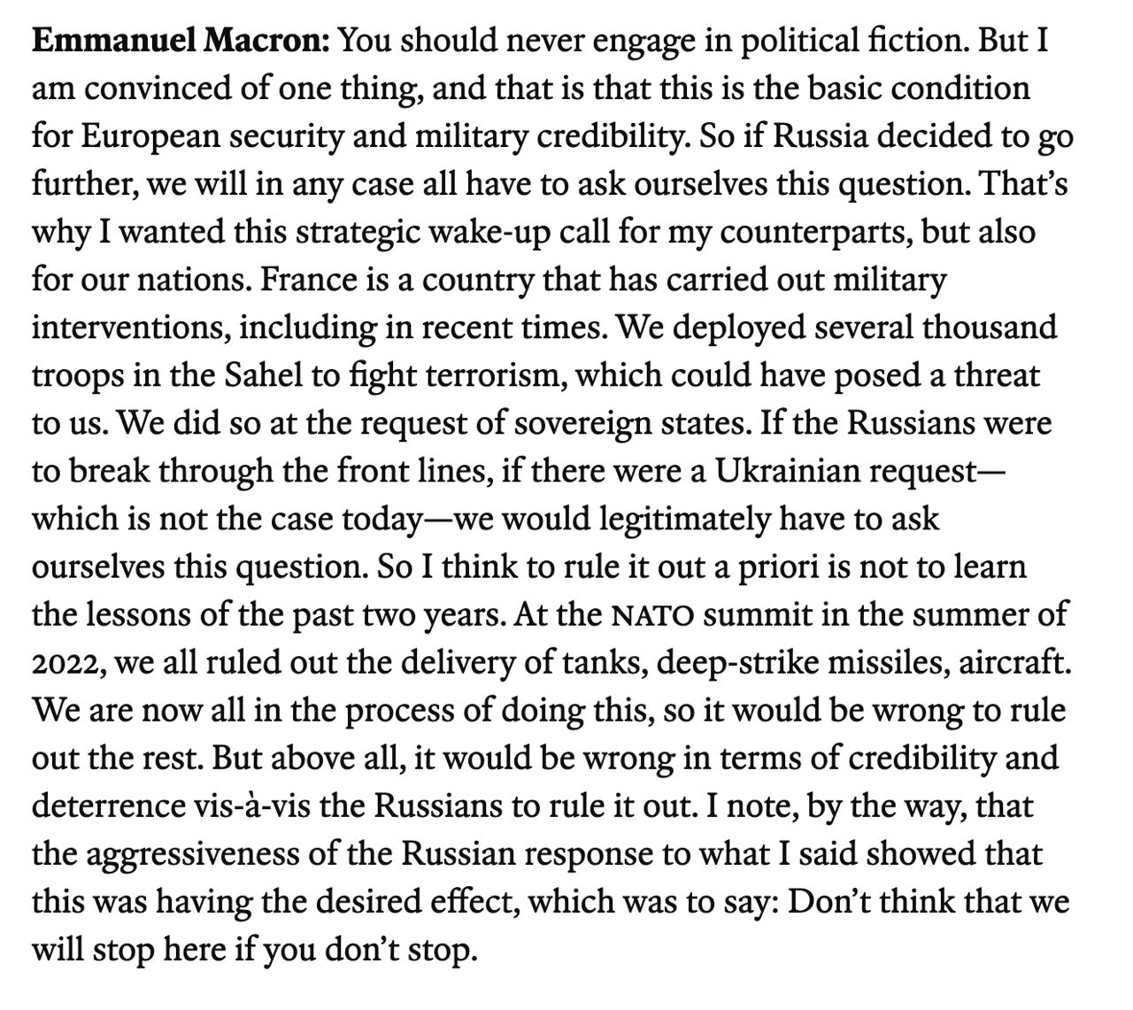 Макрон говорит, что другие страны Запада не должны отбрасывать этот вариант "априори", поскольку летом 2022 они исключили отправку танков, дальнобойных ракет и авиации, но сейчас все это поставляется Украине.