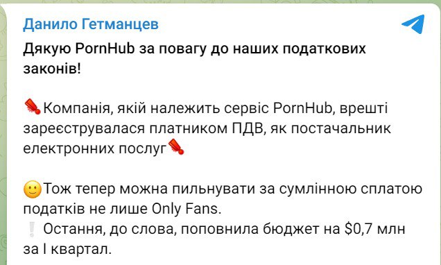 "Благодарю PornHub за уважение наших налоговых законов! Компания, которой принадлежит сервис PornHub, наконец зарегистрировалась плательщиком НДС как поставщик электронных услуг. Поэтому теперь можно следить за добросовестной уплатой налогов не только Only Fans. Последняя, ​​к слову, пополнила бюджет на $0,7 млн ​​за I квартал", - написал Гетманцев.